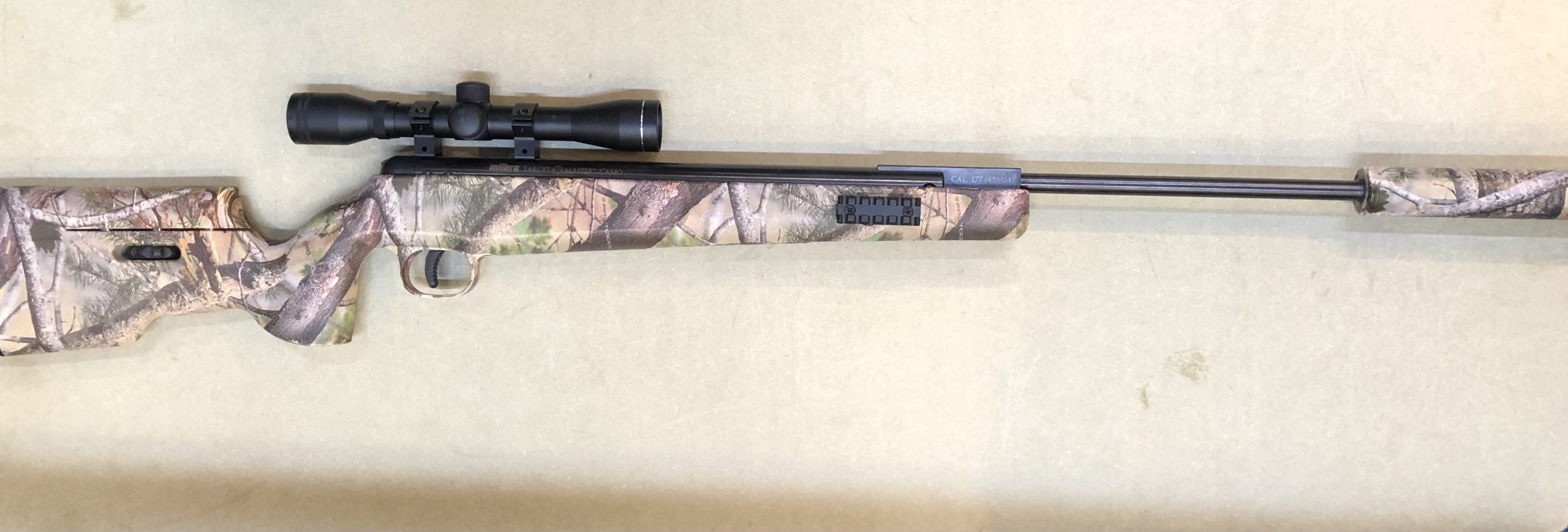 .177 Cal: break barrel air rifle, Camo livery: complete with Gun Bag, side mounted legs, sound mod and Scope